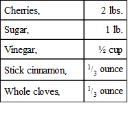 Adelaide stemmed the cherries and washed them in the colander by dipping it up and down several times in a pan of clear cold water, after which she stoned them. Into a saucepan she measured one-half a cup of vinegar. To this she added a third of an ounce each of whole cloves and cinnamon tied up in a muslin bag. The vinegar and spices Adelaide let boil gently for fifteen minutes, then she added one pound of sugar and boiled the mixture ten minutes longer, stirring constantly with the wooden spoon and skimming well. At the end of the ten minutes Adelaide dropped in the cherries and cooked the fruit gently for one-half hour. Lifting out the cherries with a skimmer, she put them into the sterilized pint jar, added the juice to overflowing, and inserted a silver knife between the jar and the fruit to let all air bubbles rise to the top and break. Then she placed on a new rubber and sealed quickly, standing the jar upside down out of the way of any draft.