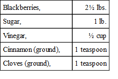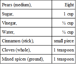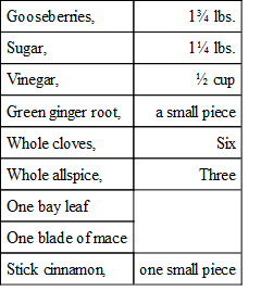 The cup of sugar, half cup each of water and vinegar, cinnamon stick and whole cloves were put into the saucepan and placed over the fire, then the teaspoon of mixed ground spices was also added; the latter were tied in a small piece of muslin.