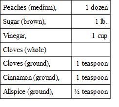 While the syrup was boiling, Adelaide poured boiling water over the peaches, and after they had stood a minute she peeled them with a silver knife. Adelaide left the peaches whole, and stuck four or five cloves in each peach.