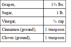 The strained pulp, the skins, the pound of sugar, the fourth of a cup of vinegar, and the teaspoon each of ground cinnamon and cloves (the spices were tied in a piece of muslin) were all put in the saucepan together and cooked until thick. Adelaide then filled the sterilized jar with the fruit, inserted a silver knife between the grapes and the jar to let the air bubbles rise to the top and break, fitted on a new rubber smoothly, sealed the jar quickly and stood it upside down out of the way of any draft. In the morning she inspected the jar carefully to be sure that it did not leak, wiped off all stickiness with a damp cloth, pasted on the label and stored the jar away in the preserve closet.