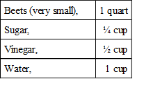 Adelaide cooked the beets until she could pierce them easily with a silver fork, plunged them into cold water, peeled and filled two sterilized pint jars. The half cup of vinegar, the fourth cup of sugar, and the cup of water, were put in a saucepan. Adelaide placed it over the fire and let it come to the boiling point.