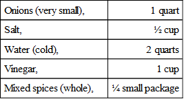 The onions she placed in a stone jar and poured over a brine made of two quarts of boiling water and one-half of a cup of salt.