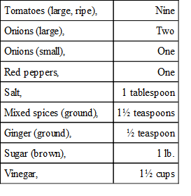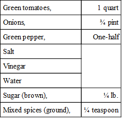 In the morning she drained off the water and emptied the contents of the bowl into the saucepan. Adelaide partly covered the tomatoes, onions and half pepper with vinegar and added sufficient cold water to just come to the top. Then she added the fourth of a pound of brown sugar and the fourth of a teaspoon of mixed ground spices.
