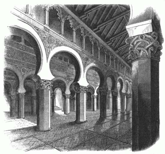 The principal light entering from the western extremity, you do not at first perceive that three of the five naves terminate at the opposite end, by half domes of more modern invention. These have since been almost built out, and do not form a part of the general view,—not in consequence of a decree of a committee of fine arts, but for the convenience of the intendant of the province, who selected the edifice, as long as it remained sufficiently weather-proof for such a purpose, for a magazine of government stores. There is no record of the antiquity of this church, supposed to be the most ancient in Toledo: at all events, it is the most ancient of those constructed by the Arabs. It was originally a synagogue, and received the above mentioned half cupolas on its conversion to a Catholic church; since which period it has been known by its present title of Santa Maria la Blanca.