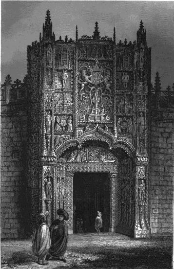 The façade of the college of San Gregorio, adjoining San Pablo, furnishes an example of the Gothic decoration brought back to its starting point. The tree is here in its state of nature; and contributes its trunk, branches, leaves, and its handfuls of twigs bound together. A grove is represented, composed of strippling stems, the branches of some of which, united and bound together, curve over, and form a broad arch, which encloses the door-way. At each side is a row of hairy savages, each holding in one hand a club resting on the ground, and in the other an armorial shield. The intervals of the sculpture are covered with tracery, representing entwined twigs, like basket-work. Over the door is a stone fourteen feet long by three in height, covered with fleurs-de-lis on a ground of wicker-work, producing the effect of muslin. Immediately over the arch is a large flower-pot, in which is planted a pomegranate tree. Its branches spread on either side and bear fruit, besides a quantity of little Cupids, which cling to them in all directions. In the upper part they enclose a large armorial escutcheon, with lions for supporters. The arms are those of the founder of the college, Alonzo de Burgos, Bishop of Palencia. On either side of this design, and separated respectively by steins of slight trees, are compartments containing armed warriors in niches, and armorial shields. All the ornaments I have enumerated cover the façade up to its summit, along which project entwined branches and sticks, represented as broken off at different lengths.