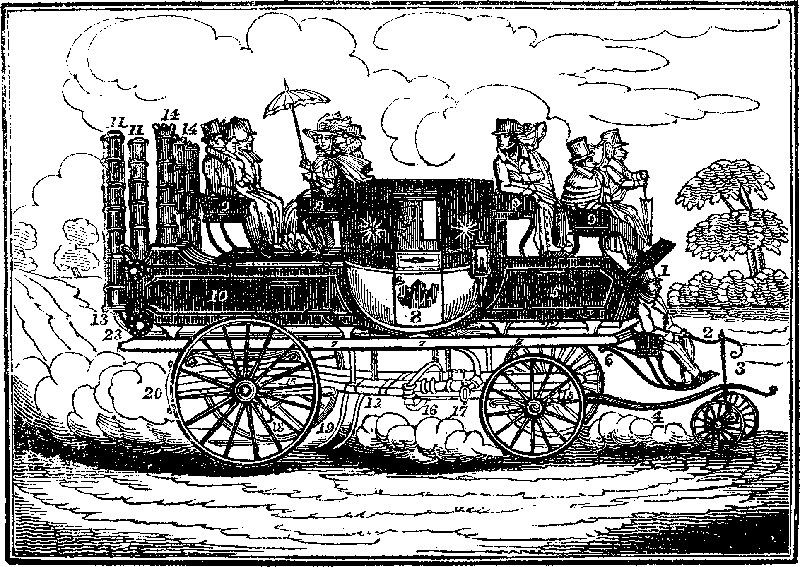 A contemporary journal illustrates Mr. Gurney's invention by the following analogy:—"It will appear not a little singular that Mr. Gurney, who was educated a medical man, has actually made the construction of the human body, and of animals in general, the model of his invention. His reservoirs of steam and water, or rather 'separators,' as they are called, and which are seen at the end of our plate, are, as it were, the heart of his steam apparatus, the lower pipes of the boiler are the arteries, and the upper pipes the veins. The water, which is the substitute for blood, is first sent from the reservoirs into the pipes—the operation of fire soon produces steam, which ascends through the pipes to the upper part of the reservoir, carrying with it a portion of water into the separators, which of course descends to the lower part, and returns to fill the pipes which have been exhausted by the evaporation of the steam—the steam above pressing it down with an elastic force, so as to keep the arteries or pipes constantly full, and preserve a regular circulation. In the centre of the separators are perforated steam pipes, which ascend nearly to the tops, these tops being of course closed, so as to prevent the escape of the steam. Through these pipes the steam descends with its customary force, and is conducted by one main pipe all along under the carriage to the end of the platform, which is, in point of fact, the water tank, where it turns under till it reaches two large branch pipes which communicate with the cylinders, from which the pistons move and give motion to the machinery. The cranks of the axle are thus set in action, and the rotatory movement is given to the wheels. By the power thus engendered also a pump is worked, and which, by means of a flexible hose, pumps the water into the boiler, keeping the supply complete. The tank and furnace, it is calculated will hold sufficient water and fuel for one hour's consumption, the former being sixty gallons."