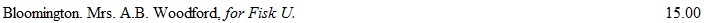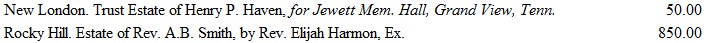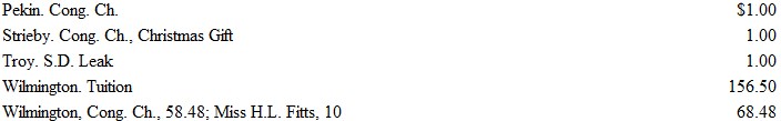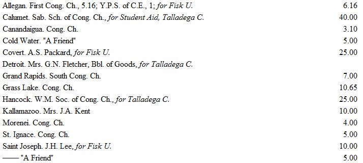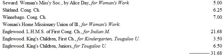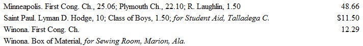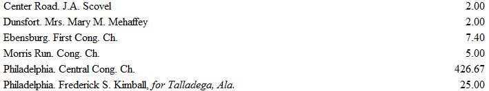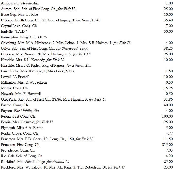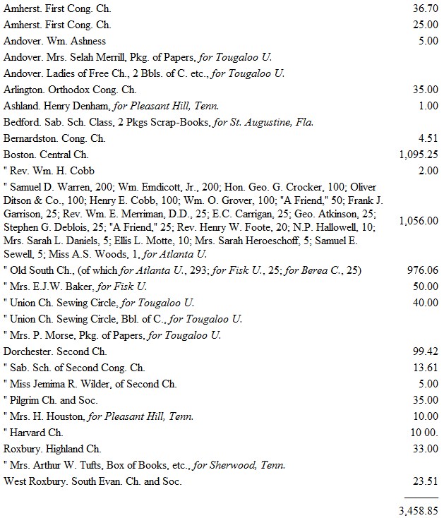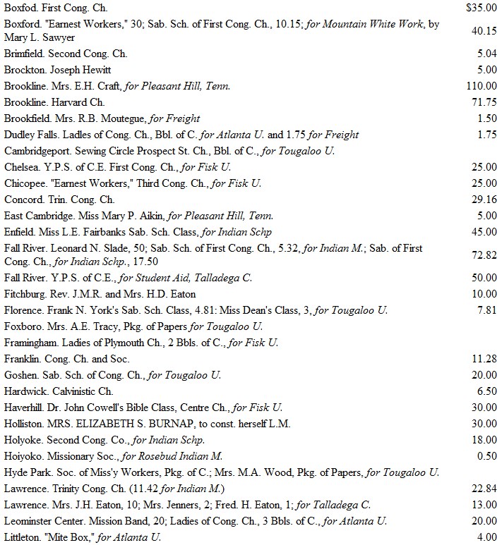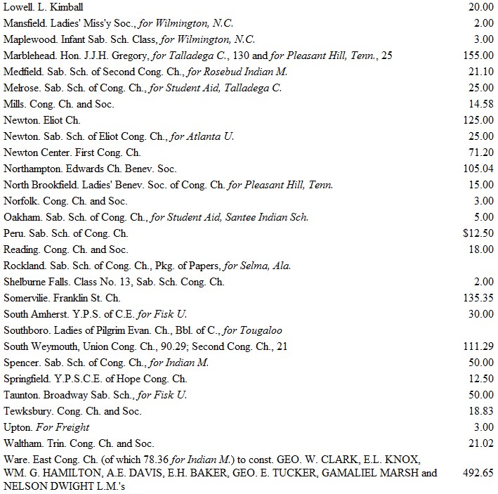 Philipps, Me. "Glad Helpers," 1 Bbl., for Williamsburg, Ky. South Berwick, Me. Ladies of Cong. Ch., 1 Bbl., for Wilmington, N.C. Boston, Mass. Miss H.H. Stanwood, 2 Boxes, for Grand View, Tenn. Newton, Mass. J.W. Davis, 1 Box Pittsfield, Mass. Free Will Soc. of First Ch., Box, for Atlanta U. Watertown, Mass. Ladies of Phillips Ch., 1 Bbl., for Pleasant Hill, Tenn.