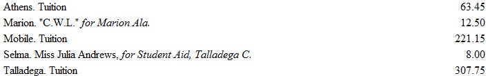 After a most satisfactory examination, six young men from the Theological Department of Talladega College were licensed to preach, and it is noteworthy, that, besides this latest gift of Talladega to the ministry, eleven of the fourteen churches represented at this meeting of the Association are ministered to by Talladega College or its graduates. It is a wonder that some man wishing to put a comparatively small sum of money where it would increase with a compound interest of blessedness till the latter-day glories have fully come, does not endow the chair of Theology at Talladega, and his brothers take up the same line of usefulness till both College and Seminary are presided for. Some who were taking the rudiments of learning here but a few years ago, and who have continued their training at very email expense, are now acceptably filling difficult and responsible positions in school, in business and in church. There is more of this work to be done, and to be allowed to help seems a privilege precious enough to make life vastly desirable.
