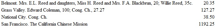 The intention was to give one month of service at each mission, and one gratifying feature of our experience has been that at no point has this one month been deemed sufficient. In every case an urgent plea has come for a longer visit and a larger work. In some cases, as with Chin Toy in Sacramento, and Loo Quong at San Diego, it has been necessary to yield to these appeals. The work needed could not be fulfilled in the month assigned. But in general we have adhered to the original plan, so as to cover the whole field.