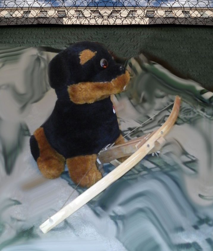 После этого главарь занялся лаподелием, и тут-то ему и пригодились газеты. Из них он склеил несколько трубок разной толщины, а также одну совсем тонкую, словно струна. Три довольно толстых бумажных трубки пёс соединил вдоль – это должно было дать прочности основе его конструкции, затем две трубочки потоньше склеил аналогичным образом с той же целью, а после скрепил обе полученные детали поперёк, в виде буквы Т. Теперь Рыкала принялся за бумажную струну: проверив её на разрыв и на растяжение, он ловко примотал её к концам двухтрубочной детали, таким образов получив нечто, отдалённо напоминавшее арбалет. Несколько щелчков бумажной тетивой – и пёс убедился, что всё довольно прочно держится, и, быть может, даже способно стрелять, особенно если сочинить удобный спусковой механизм. Теперь главарь засунул всё это в дальний угол, чтобы клей качественно засох, и принялся ждать.
