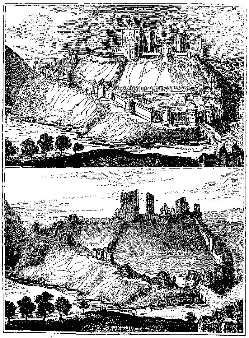 In the year 1645 and 1646, the Castle was again besieged, or rather blockaded, by the parliament’s forces, who obtained possession through the treachery of Lieutenant-Colonel Pitman, an officer of the garrison. When it was delivered up, the parliament ordered it to be demolished; and the walls and towers were undermined, and thrown down, or blown up with gunpowder. “Thus this ancient and magnificent fabric was reduced to a heap of ruins, and remains a lasting monument of the dreadful effects of anarchy, and the rage of civil war. The ruins are large, and allowed to be the noblest and grandest in the kingdom, considering the extent of the ground on which they stand. The vast fragments of the King’s Tower, the round towers leaning as if ready to fall, the broken walls, and vast pieces of them tumbled down into the vale below, form such a scene of havoc and desolation, as strikes every curious spectator with horror and concern.”3