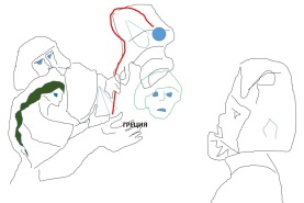 Здесь и без обводки видна птица сверху, голова птицы ниже, человеческие головы и морда быка. Над моей головой на камне выбита русская буква Ш или трезубец, перед ней виден круг, это буква О. Между этими двумя буквами видна латинская U, как подкова. Это самая часто встречающаяся буква на мегалитах, и она всегда самая крупная. Так что в этом углу, начиная сверху, можем прочитать: «Рош. Ниша. 59». Далее, по горизонтали: «Винора торс. Роси (Русь). Храм. Нора духа Бин. Шира. Бессмертный Ур (психическая энергия)». Вот вам и намёк, что эти мегалиты несут энергию в виде излучения и бессмертие. Слово Винор схоже с английским словом winner – победитель, а имя Бин означает «активный» (сайт «Значение имени»). На реке Шира я уже выше показала наличие множества изображений духов.