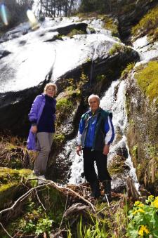 Зуевский водопад предстал во всей красе с высоты противоположного склона ущелья. Длина его метров 200. Как сказал Станислав Владимирович, вода на его камнях – редкость. Но нам повезло, хотя она помешала увидеть надписи на мегалитической основе. Спустя годы, я заметила ещё кое-что на каменном склоне водопада: огромное лицо, смотревшее на нас, и не одно: