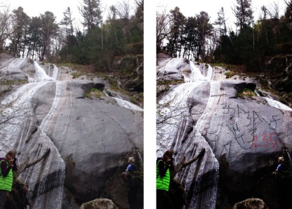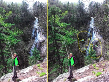 Через некоторое время пребывания у подножия водопада, мне стало плохо. Состояние нормализовалось после ухода от него. Какое-то излучение камень водопада имеет. Вроде, многие были в этих местах, но я вам покажу то, что они не заметили. Итак, начинаем смотреть внимательно. Только, для того, чтобы что-то прочитать, надо увеличивать контрастность фотоснимков и уменьшать яркость. Тогда на камнях проступают буквы и лики:
