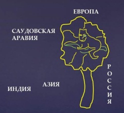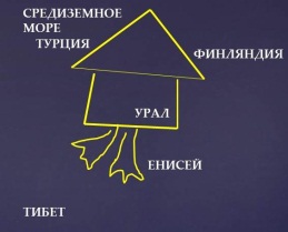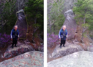 Валун очень похож на стоящего медведя. Пробую из выбитых на нём и на постаменте букв собрать текст (обвела красным): «Самара, Аркаим. Река рая Ками. Мара. Изба. Кот смотрит. Аркози». О реке Кама много написано на мегалитической горе Сораксан в Южной Корее. Как видите, она упоминается и здесь, за тысячи километров, потому – что страна Тартария находилась на всей Евразии. Изба, Мара и кот сразу напоминают о сказке А.С. Пушкина «Руслан и Людмила». Сказки сказками, а на рельефе изба, Баба Яга и кот на дубе есть на самом деле (подробнее смотрите в моей книге «Космические сказки Пущкина»):
