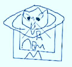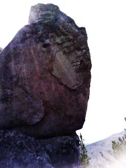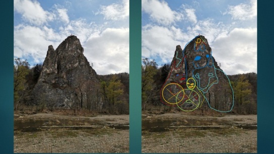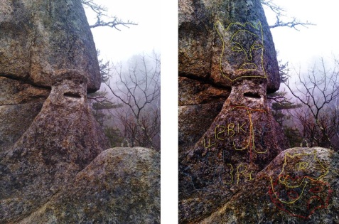 Глобально, на левой боковой скале виден профиль человека. А прямо, с учётом игры тени, вырисовывается морда зверя. В нижнем правом углу можете увидеть голову лежащего человека с закрытыми глазами и с надписями на лбу: