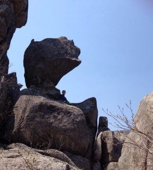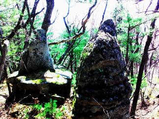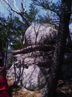 После ночёвки на турбазе, на следующий день, мы отправились в Белый Город. На задней точке мы преодолели реку по брошенному через него толстому кедру, поднялись по крутым склонам. Клещи во множестве падали на нас, шедших первыми. Всех успели снять, никто не впился. На Город уже наступали лесорубы, их дорога вплотную прошла к каменным изваяниям. Кто знает, сколько им ещё дадут прожить. Возможно, издание книг о мегалитических комплексах позволит обратить внимание властей на сохранение мегалитических памятников наших древних предков. Первым на входе виднеется Воин, призывающий соблюдать тишину или скрыть тайну: