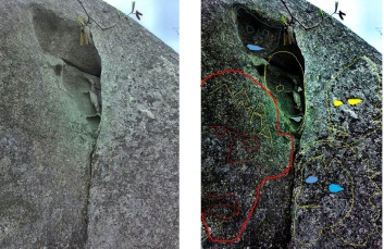 Ближе на каменных стенах видны сразу пять каменных лиц и висячий камень. В смеси выбитых букв вычленила слова: «Мир Кама. Шар. Коровий мир Ара». Кама – это река в России, шаром представлен Тор Руси у Аркаима, а морда коровы выбита на всём полуострове Индостан. Кама изобильно украшена важными изображениями ариев, и они уже рассмотрены в моей книге «Сораксан – Храм солнца Ари».