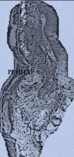 Здесь на рыбе лежит ступа с выступом в виде зловещей головы. В то же время, внизу ступы выбито лицо, а сам её корпус является головой воина в шлеме с прикрытым ухом. В верхней части головы рыбы выбита морда льва, она так и подписана. Буквы здесь тоже сливаются в слова о Шории, Боге Бир (медведя), троне и торе Рош (Руси). Такую фигуру вы увидите на рельефе планеты, если посмотрите на центр Азии с очень большой высоты с севера: