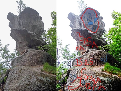 Справа явно виден каменный медведь, на левом столбе тоже выбита звериная морда. Здесь написано о Пира, город такой есть в Словакии. На рельефе в этом месте выбита женщина, сидящая на быке, голова «мокрого» воина и такой же рельеф, как этот каменный медведь: