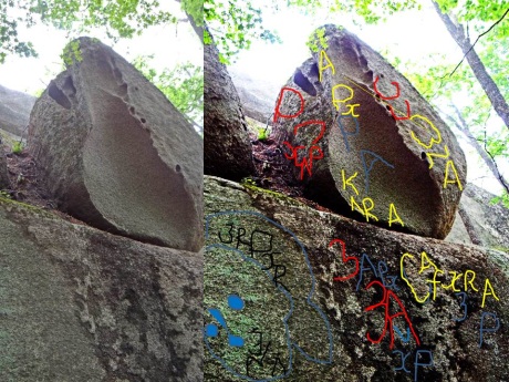 В нижней части мегалитического камня выбиты цифры 235 и множество букв. Все я не обвожу, так как картинка станет месивом. Сложив некоторые вместе, получаю текст: «Зри Зитар. Титири зив. Зизи». Перевожу: «Смотри ситару (музыкальный иструмент, https://ru.glosbe.com/eu/ru/zitara). Титири (город в Чили и в США) зев. Жница (Imya.com)». Уже не раз на камне упоминается ситара. Первый раз я нашла её изображение на скале недалеко от Двух Братьев. Действительно, у каменного лица водопада виден круг, как музыкальный инструмент. Осталось посмотреть на рельеф в Чили, есть ли там изображения: