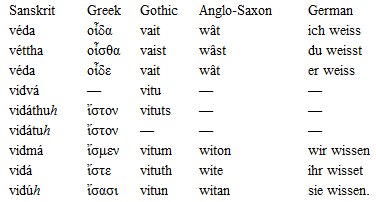 Nor Aught nor Nought existed; yon bright skyWas not, nor heaven's broad woof outstretched above.What covered all? what sheltered? what concealed?Was it the water's fathomless abyss?There was not death—yet was there nought immortal,There was no confine betwixt day and night;The only One breathed breathless by itself,Other than It there nothing since has been.Darkness there was, and all at first was veiledIn gloom profound—an ocean without light—The germ that still lay covered in the huskBurst forth, one nature, from the fervent heat.Then first came love upon it, the new springOf mind—yea, poets in their hearts discerned,Pondering, this bond between created thingsAnd uncreated. Comes this spark from earthPiercing and all-pervading, or from heaven?Then seeds were sown, and mighty powers arose—Nature below, and power and will above—Who knows the secret? who proclaimed it here,Whence, whence this manifold creation sprang?The Gods themselves came later into being—Who knows from whence this great creation sprang?He from whom all this great creation came,Whether his will created or was mute,The Most High Seer that is in highest heaven,He knows it—or perchance even He knows not.The grammar of the Veda (to turn from the contents to the structure of the work) is important in many respects. The difference between it and the grammar of the epic poems would be sufficient of itself to fix the distance between these two periods of language and literature. Many words have preserved in these early hymns a more primitive form, and therefore agree more closely with cognate words in Greek or Latin. Night, for instance, in the later Sanskrit is nisâ, which is a form peculiarly Sanskritic, and agrees in its derivation neither with nox nor with νὑξ. The Vaidik nas or nak, night, is as near to Latin as can be. Thus mouse in the common Sanskrit is mûshas or mûshikâ, both derivative forms if compared with the Latin mus, muris. The Vaidik Sanskrit has preserved the same primitive noun in the plural mûsh-as = Lat. mures. There are other words in the Veda which were lost altogether in the later Sanskrit, while they were preserved in Greek and Latin. Dyaus, sky, does not occur as a masculine in the ordinary Sanskrit; it occurs in the Veda, and thus bears witness to the early Aryan worship of Dyaus, the Greek Zeús. Ushas, dawn, again in the later Sanskrit is neuter. In the Veda it is feminine; and even the secondary Vaidik form Ushâsâ is proved to be of high antiquity by the nearly corresponding Latin form Aurora. Declension and conjugation are richer in forms and more unsettled in their usage. It was a curious fact, for instance, that no subjunctive mood existed in the common Sanskrit. The Greeks and Romans had it, and even the language of the Avesta showed clear traces of it. There could be no doubt that the Sanskrit also once possessed this mood, and at last it was discovered in the hymns of the Rig-veda. Discoveries of this kind may seem trifling, but they are as delightful to the grammarian as the appearance of a star, long expected and calculated, is to the astronomer. They prove that there is natural order in language, and that by a careful induction laws can be established which enable us to guess with great probability either at the form or meaning of words where but scanty fragments of the tongue itself have come down to us.