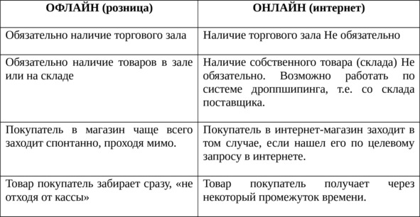 У онлайн и офлайн торговли есть несколько принципиальных отличий. Проще их представить в таблице: