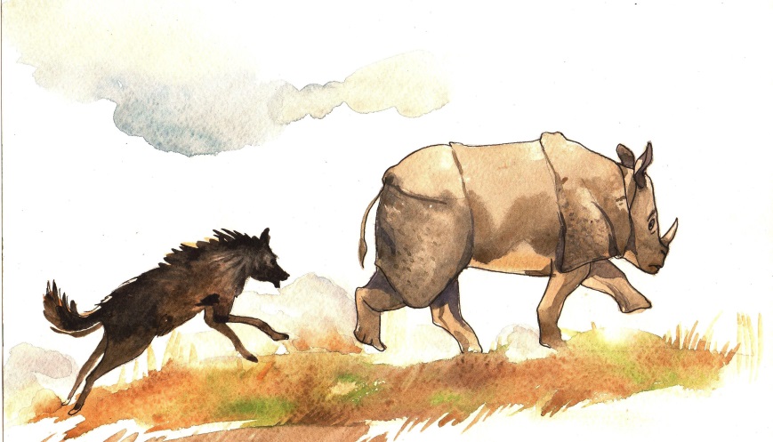 Только старая Гиена, давний враг Чёрного носорога, могла совладать с этим безобразником. Носорог так боялся Гиены, что, лишь почуяв её запах, убегал неуклюжим галопом.