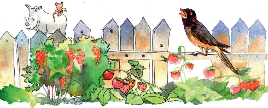 Рози сажала клубнику. Она очень удивилась, когда на неё свалились Букс, Красноклюв и качающаяся из стороны в сторону на хвосте носорога обезьяна.