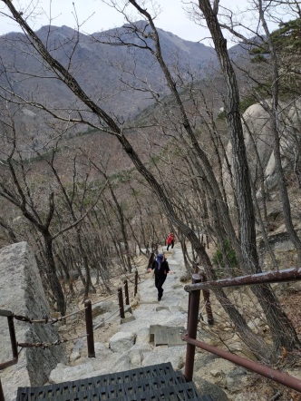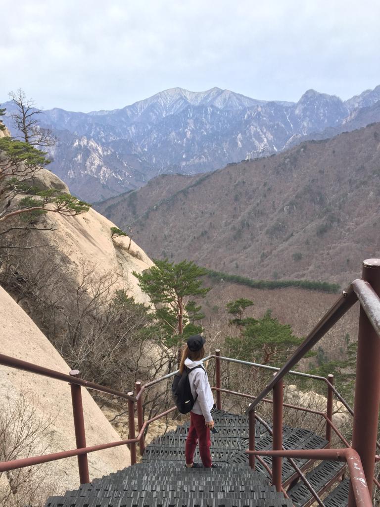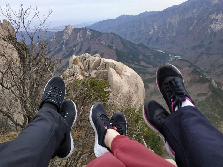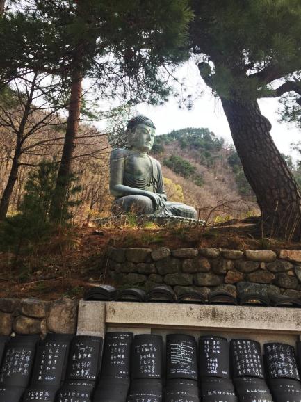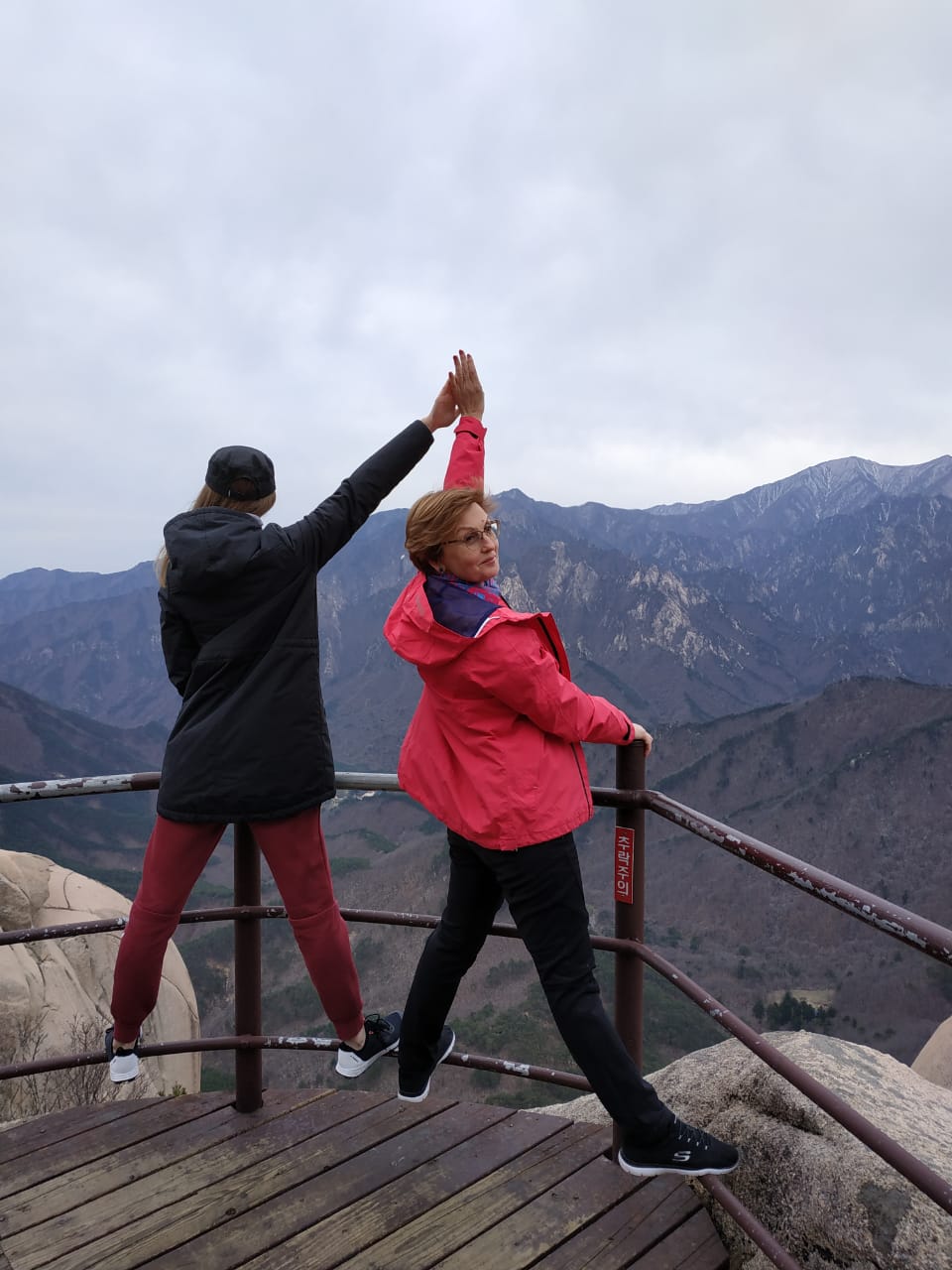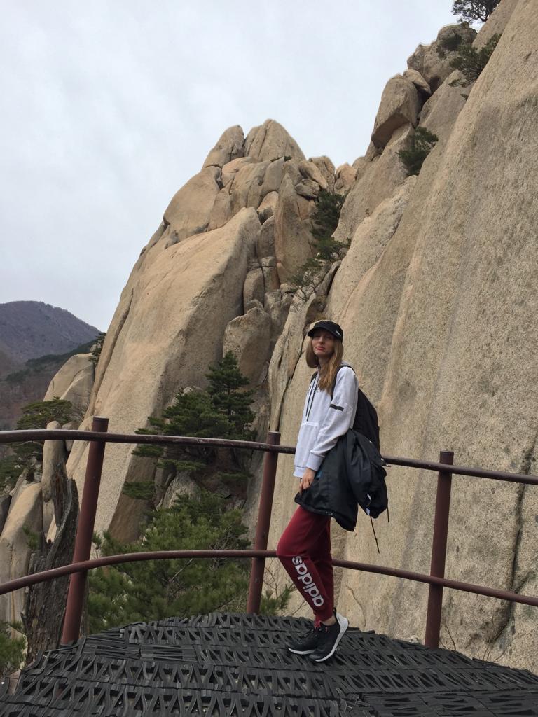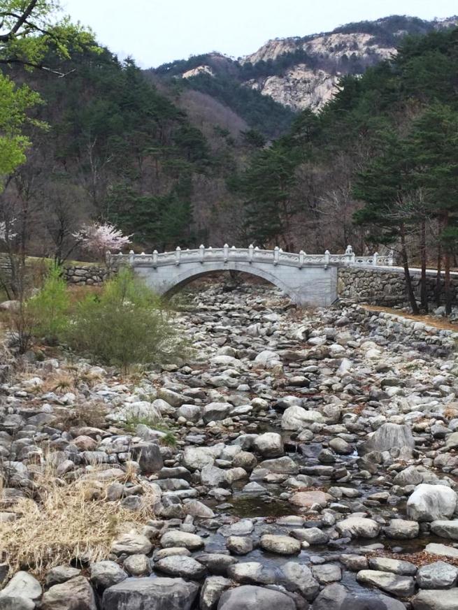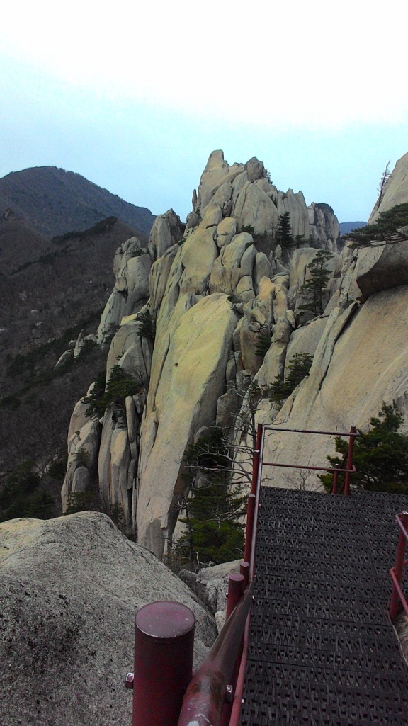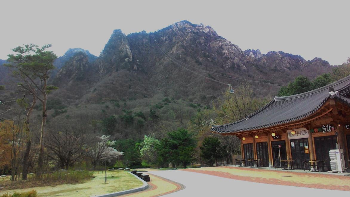 Сораксан – горный парковый комплекс в Южной Корее. От Сеула надо ехать 3 часа на автобусе в Сокчо, от города Сокчо минут 30 езды на автобусе 7-1. Народ там дружелюбный, немного понимают по-английски, язык жестов отлично понимают. И чистота поражает. Даже по трассе, по обочинам и на полях нет мусора. Русским бы поучиться. Горы там высокие и необычные, но одна, где находится храм, отличается по цвету от окружающих гор: