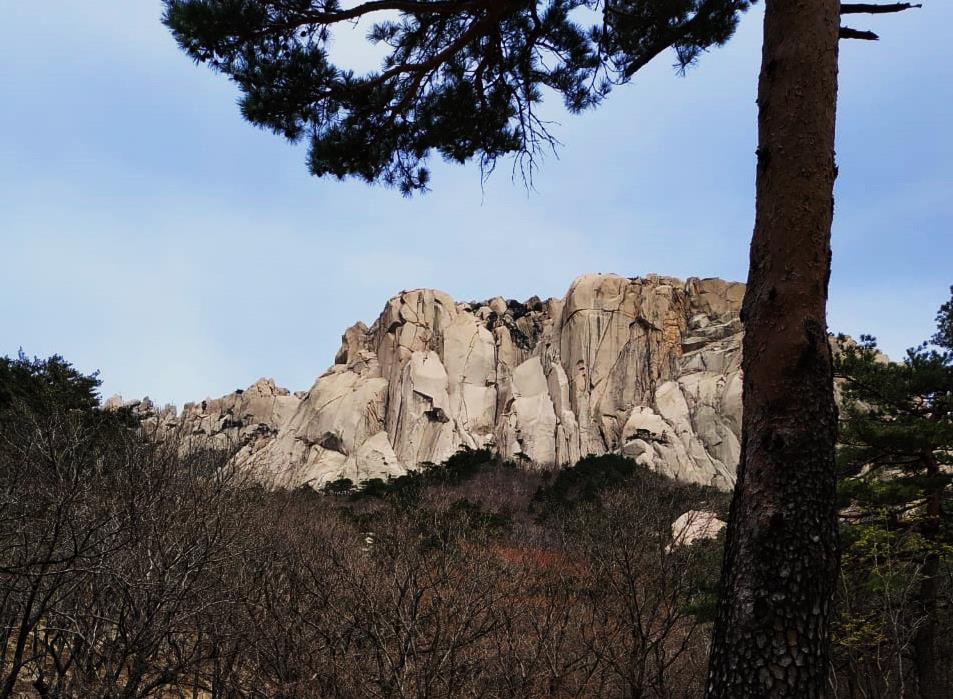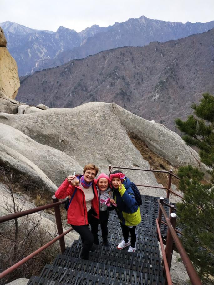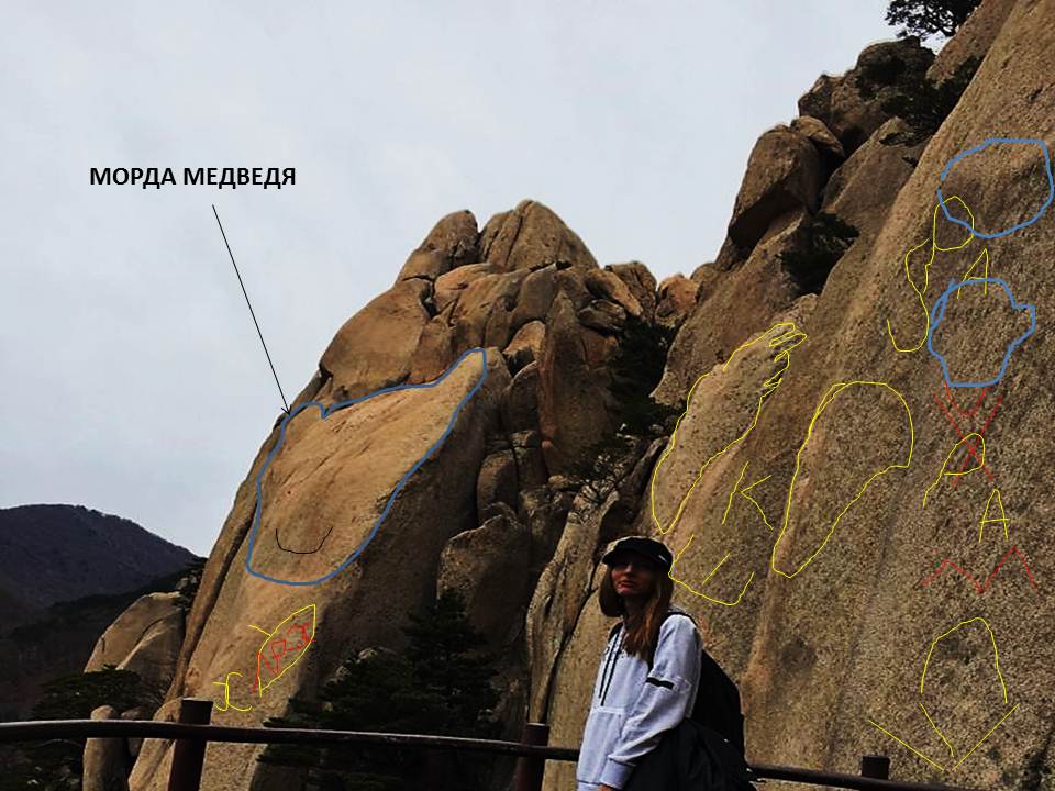 На скалах, справа, выделяется звериное лицо, похожее на медведя. На вершине мы встретили двух кореянок, которые заботливо предложили нам оставшиеся от их перекуса варёные яйца: