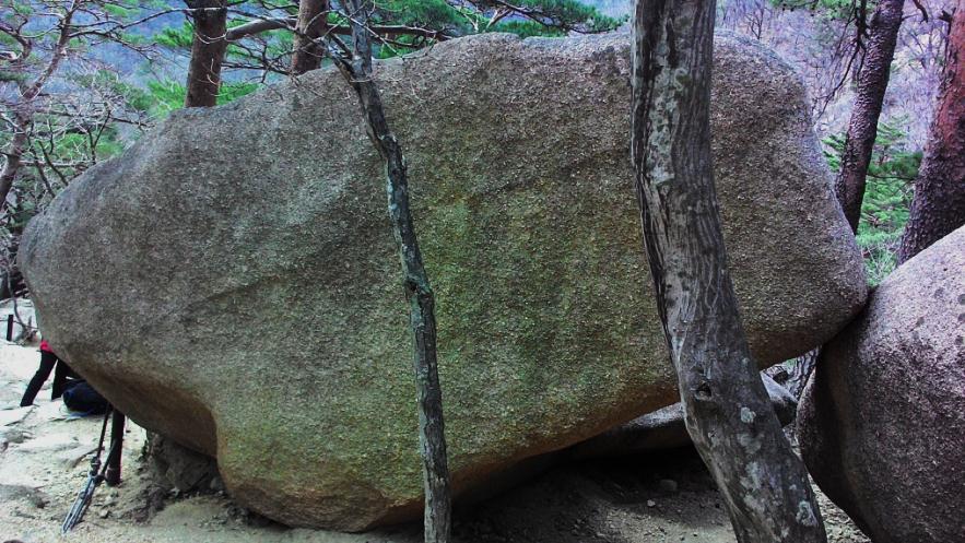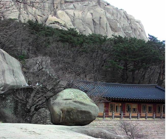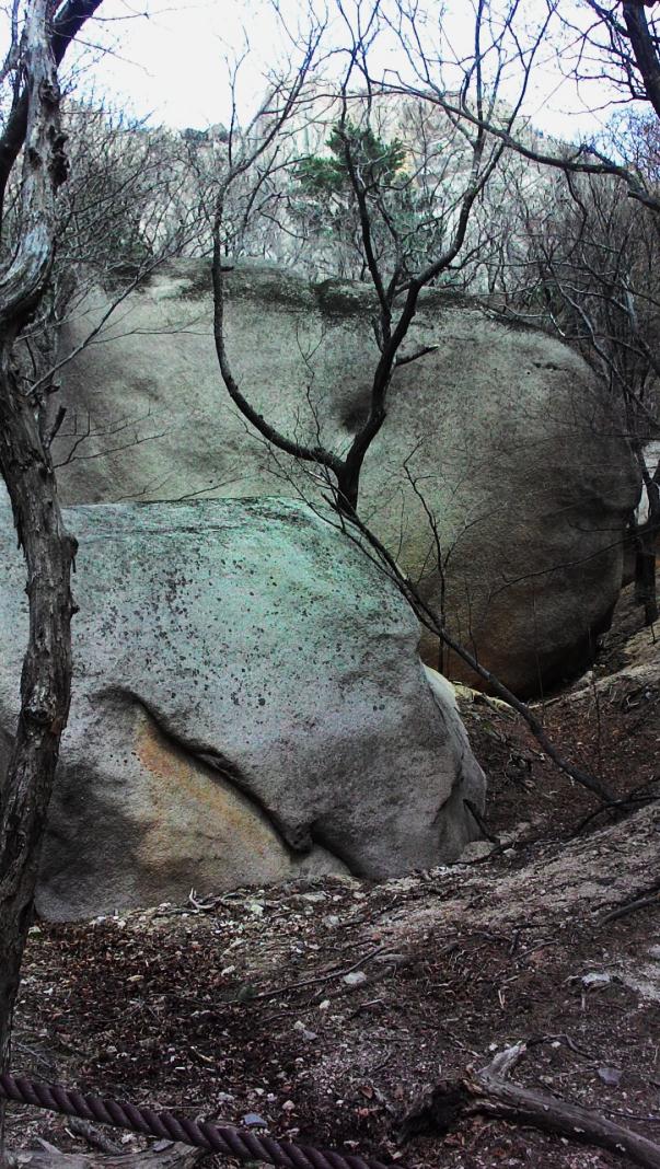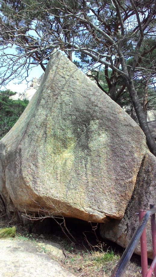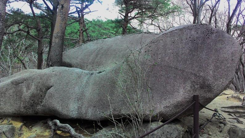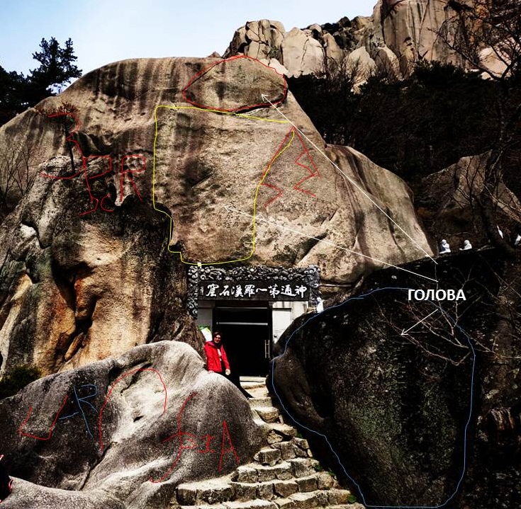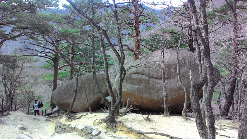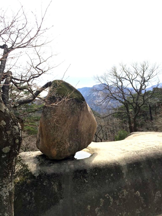 Это огромное «яйцо» под нашими ногами – явно, рукотворное. Оно похоже и на руки, держащие цветок. С правого нижнего края виднеется звероподобное существо. Вот что, пишет о Сораксане Википедия: «Сораксан – самые высокие горы хребта Тхэбэксан в провинции Канвондо на востоке Южной Кореи. Расположены в национальном парке рядом с городом Сокчхо. Сораксан – третьи по высоте горы в Южной Корее после вулкана Халласан на острове Чеджудо и горы Чирисан на юге страны. Пик Тэчхонбон достигает 1 708 метров в высоту… У входа в национальный парк находятся знаменитые водопады Юктам и Пирён. Ульсанбави – скальное образование уникальной формы в национальном парке Сораксан. Высота 873 метра. На нём находятся два буддистских храма и шарообразный камень (Хындыльбави), стоящий на верхушке камня большего размера. Этот камень 5 метров в высоту. Согласно легенде, Ульсанбави, имеющий, по представлениям корейцев, одушевлённую природу, пришёл на Сораксан из города Ульсан с юга Кореи. После того, как были созданы горы Кымгансан, Ульсанбави отправился в путь на север в качестве представителя города. К несчастью, Ульсанбави пришёл очень поздно – для него не нашлось ночлега – и ему пришлось отправится обратно на юг. Однажды камень решил остановиться на ночь в горах Сораксан и они ему настолько понравились, что он решил остаться там навеки…». Да, камень этот очень похож на шар, но с цветком внутри.