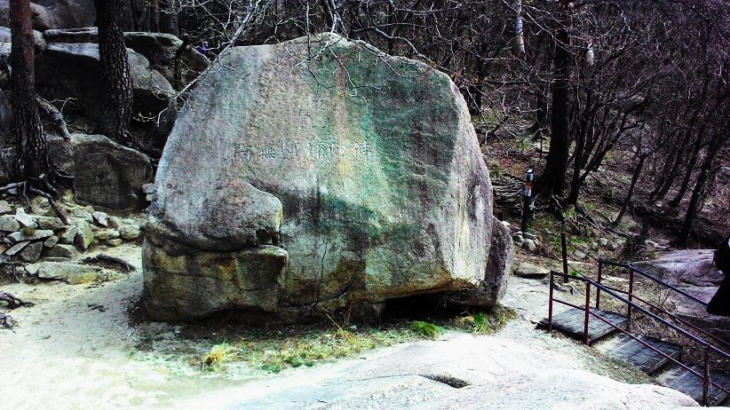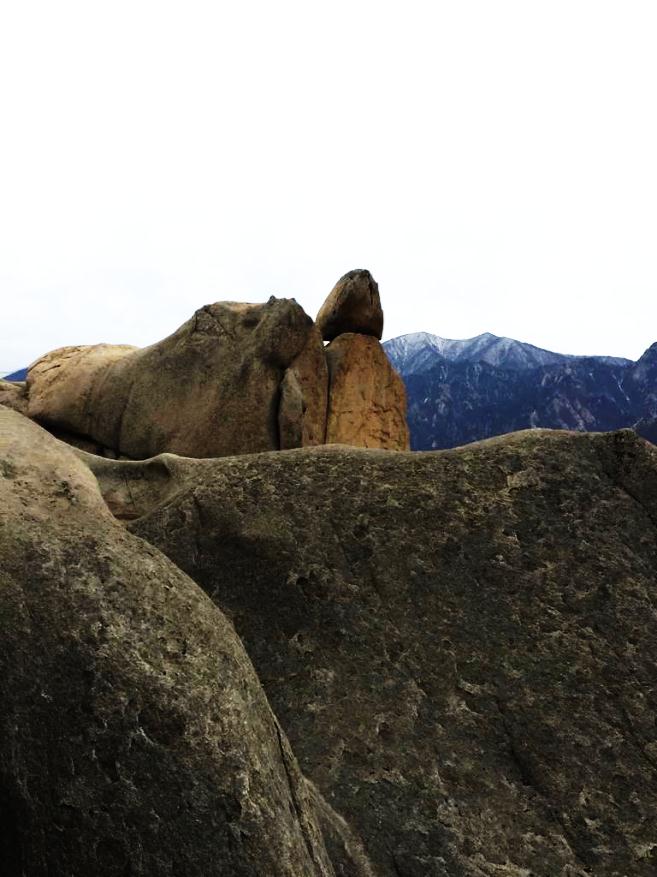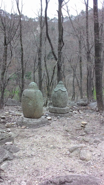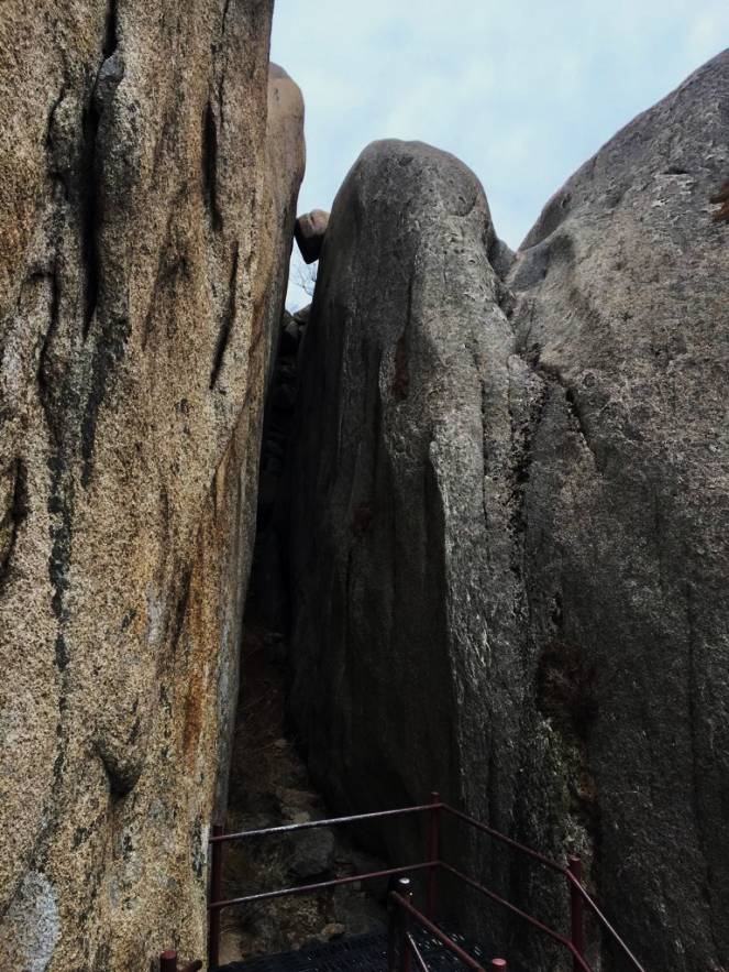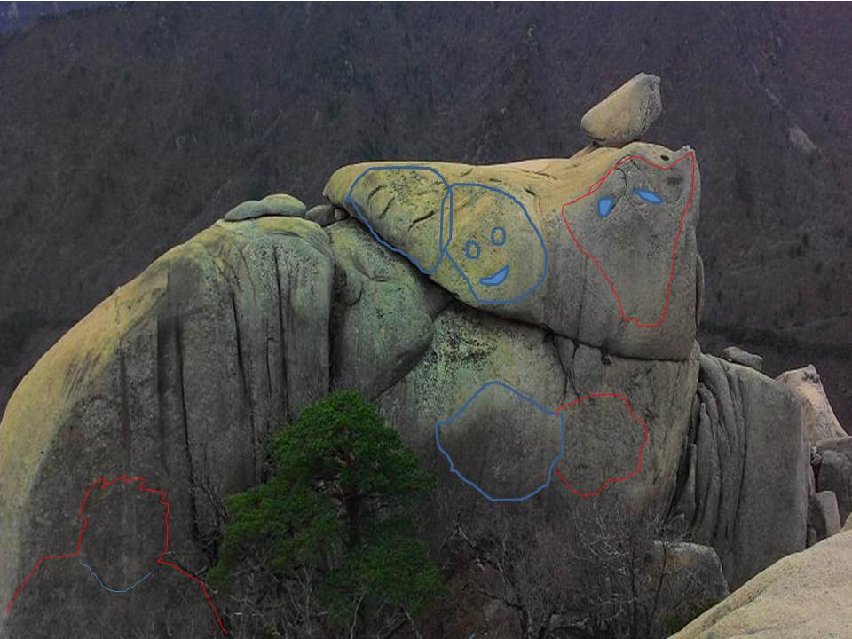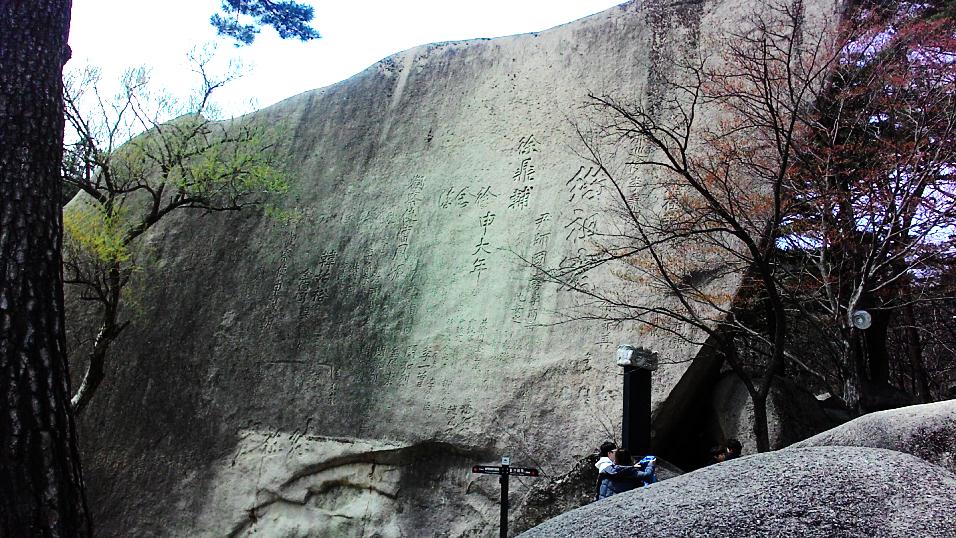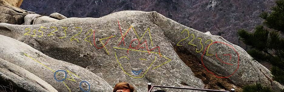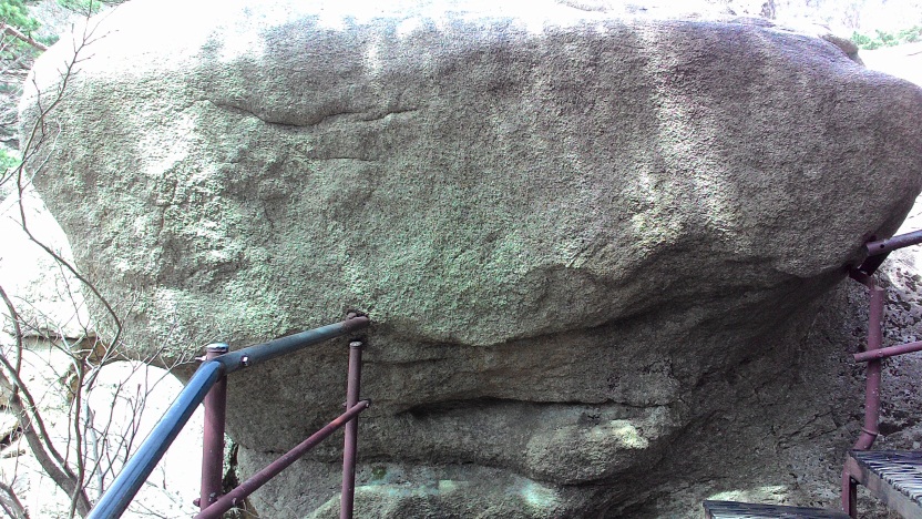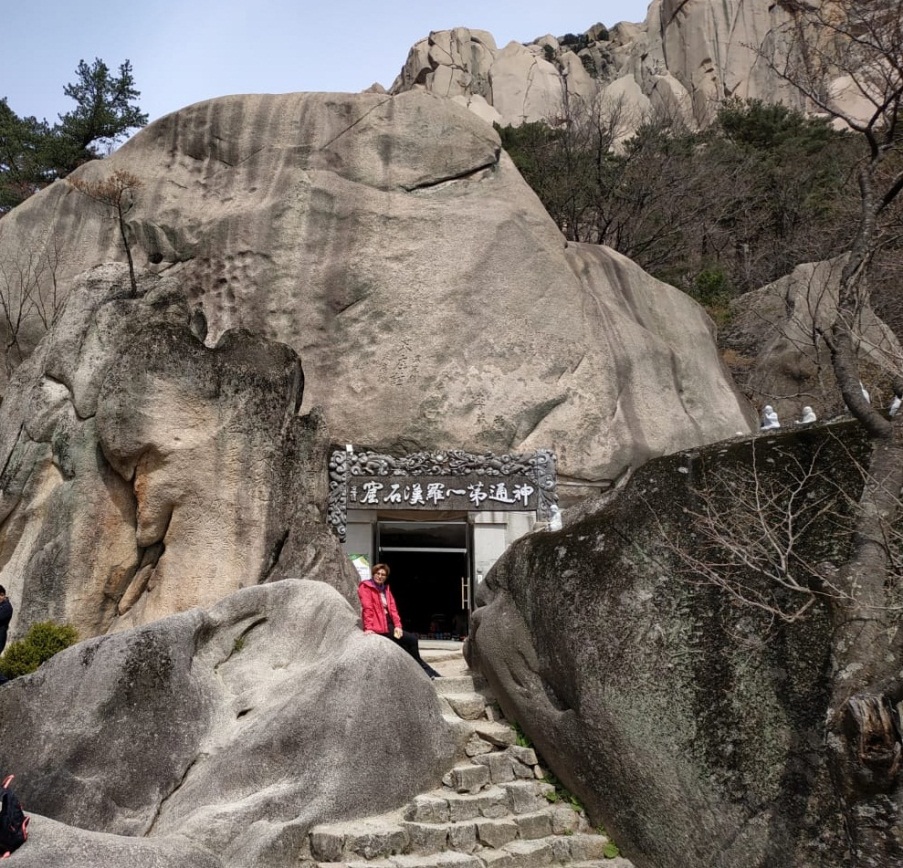 Это огромное «яйцо» под нашими ногами – явно, рукотворное. Оно похоже и на руки, держащие цветок. С правого нижнего края виднеется звероподобное существо. Вот что, пишет о Сораксане Википедия: «Сораксан – самые высокие горы хребта Тхэбэксан в провинции Канвондо на востоке Южной Кореи. Расположены в национальном парке рядом с городом Сокчхо. Сораксан – третьи по высоте горы в Южной Корее после вулкана Халласан на острове Чеджудо и горы Чирисан на юге страны. Пик Тэчхонбон достигает 1 708 метров в высоту… У входа в национальный парк находятся знаменитые водопады Юктам и Пирён. Ульсанбави – скальное образование уникальной формы в национальном парке Сораксан. Высота 873 метра. На нём находятся два буддистских храма и шарообразный камень (Хындыльбави), стоящий на верхушке камня большего размера. Этот камень 5 метров в высоту. Согласно легенде, Ульсанбави, имеющий, по представлениям корейцев, одушевлённую природу, пришёл на Сораксан из города Ульсан с юга Кореи. После того, как были созданы горы Кымгансан, Ульсанбави отправился в путь на север в качестве представителя города. К несчастью, Ульсанбави пришёл очень поздно – для него не нашлось ночлега – и ему пришлось отправится обратно на юг. Однажды камень решил остановиться на ночь в горах Сораксан и они ему настолько понравились, что он решил остаться там навеки…». Да, камень этот очень похож на шар, но с цветком внутри.