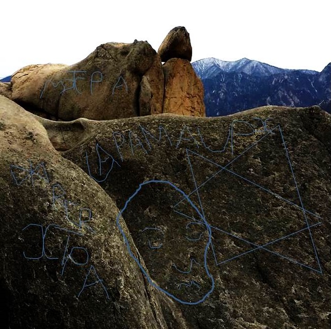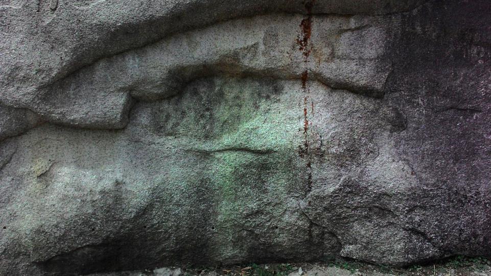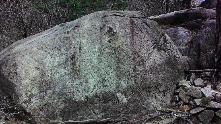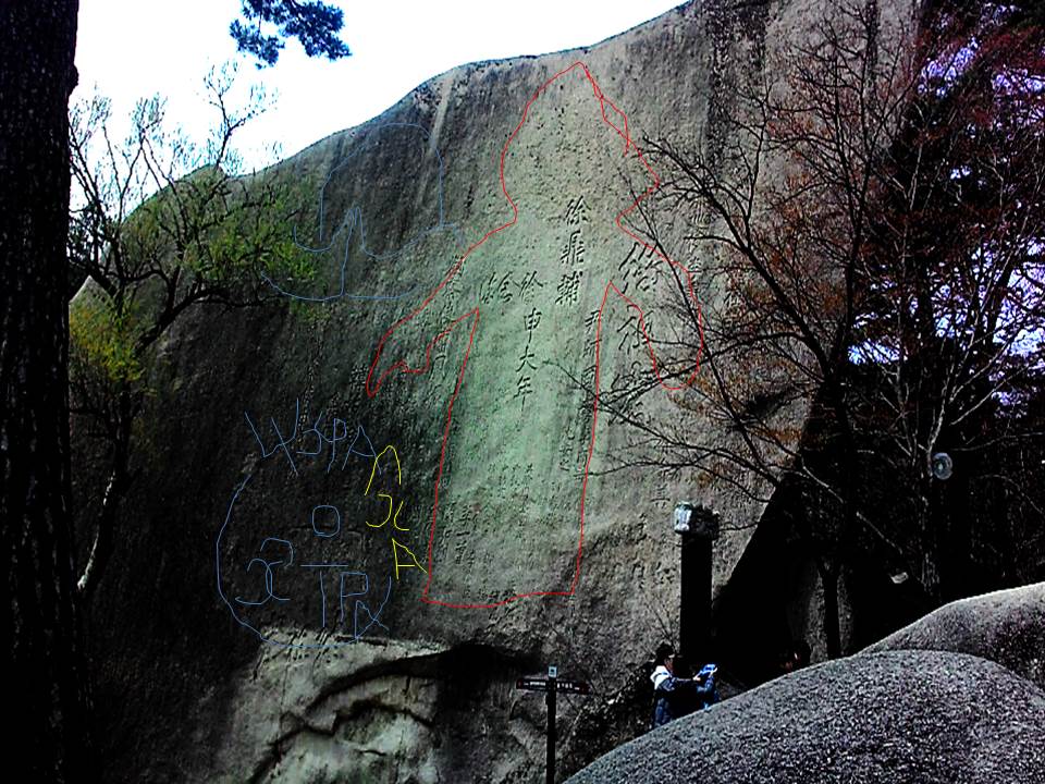 В плоскости камня выбиты надписи на корейском языке, но среди них видны другие буквы и изображения лиц. В центральной части – лицо, на нём же – большой треугольник. Тут же виден человек, держащий руки в молитве: