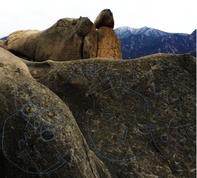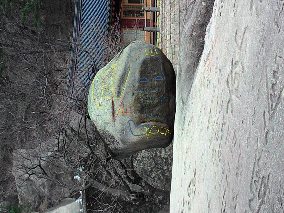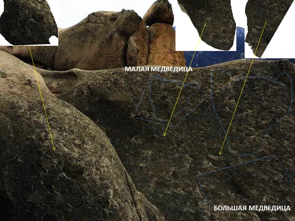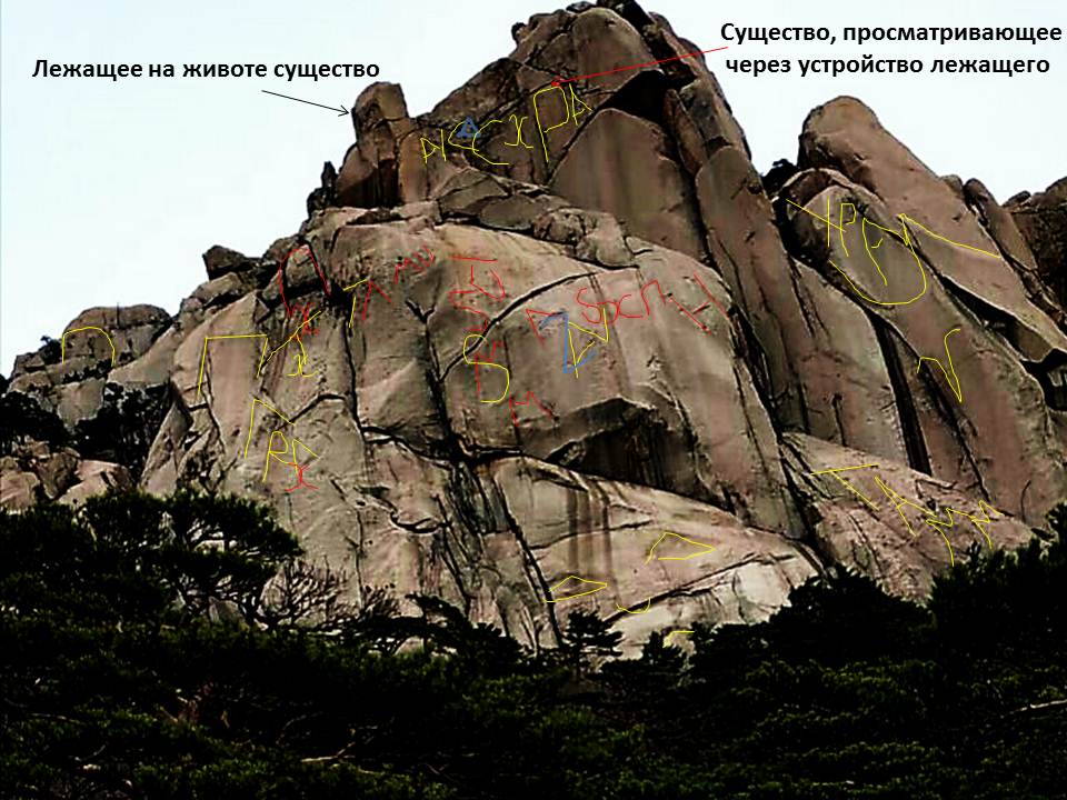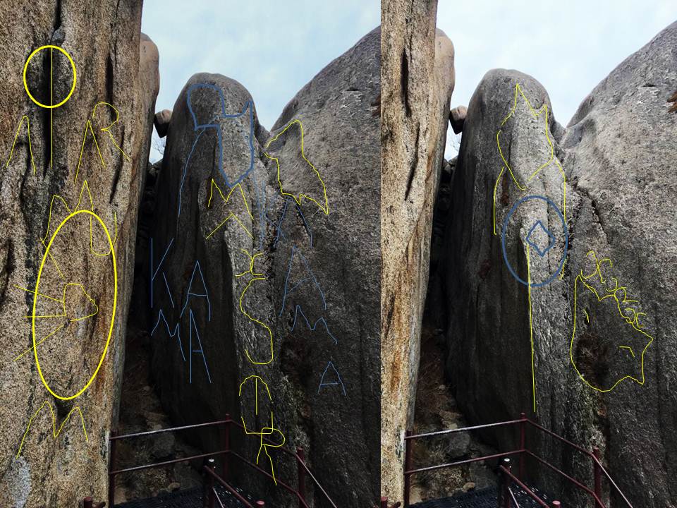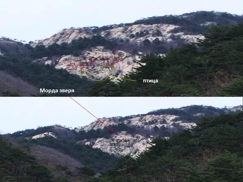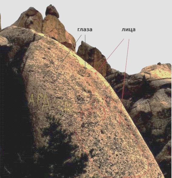Верхние камни похожи на головы людей, а ближний камень соответствует камню верхушки горы в Сораксане. Стоит ожидать, что автор – создатель горы, один и тот же. Как всегда, увеличивая контрастность снимка (кто-то улучшает фотографии, а мне приходится ухудшать, для дела☺), можно увидеть знаки: