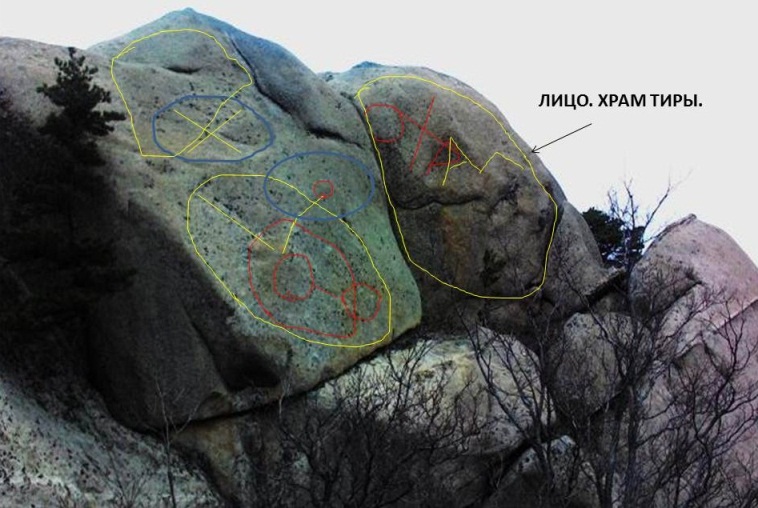 Это мегалиты маршрута «Сторожевой город» возле посёлка Первостроителей Приморья России. На этих камнях написано о Дии – Земле, знаком которой является крест, заключённый в круг. А также о Роше – князе Руси, Шиве – создателе Вселенной, Марии (сбоку видна женская голова в кокошнике), Аркаиме. Есть слово «Чира», «чирий» (в смысле, выступ) на нижнем камне слева, есть такая река Чир в России и несколько населённых пунктов по миру с корнем «чир» в названии. Фигуры, похожие на каменные, нашлись на рельефе около Чира-Юрт Чеченской республики. Посмотреть на них вы сможете на спутниковых картах в Интернете. Привести их в книге не имею права, поэтому показываю рисунок с рельефа: