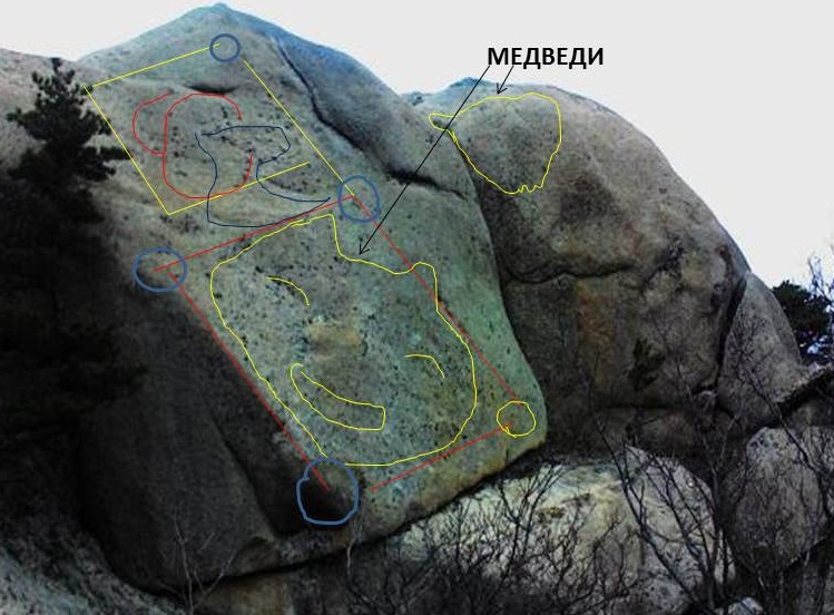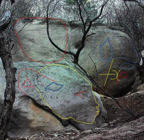 Здесь, верхний камень напоминает камень на вершине мегалита Сторожевого города Приморья. Знаков, изображений так много, то, чтобы не показать месиво, покажу несколько обводок на камнях: