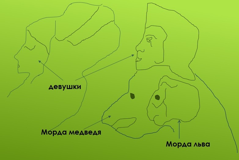 Пухлые губы, нос и один глаз с ресницами, как очертания НЛО, так хорошо видны, даже обводить нет надобности, но надо же доказать, что они есть. Лиц здесь несколько, птицы есть. Внизу, под губами, идёт надпись «Ирса». Есть такая река и посёлок в России (сайт «Академик»). На рельефе возле реки Ирса находятся рисунки головы тех самых ариев и медеведя, которые уже показаны выше, у реки Кама.