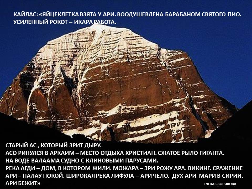 Духовный центр мира, находящий в Шамбале, по мнению жены Николая Константиновича Рериха Елены Ивановны Рерих, в будущем должен переместиться в Россию. Россия должна стать тем пространством, где духовное и материальное максимально сблизятся, и благодаря своему особому духовному пути, Россия обретет возможность стать новой Шамбалой» (https://zen.yandex.ru/media/zeitgeist/zachem-na-samom-dele-iskali-i-iscut-shambalu). Кажется, такой процесс уже идёт. Всё больше встречаю людей, прочитавших книги этих замечательных россиян, советую сделать это всем. Особенно, если эти же знания даны нам Высшими (Божественными) существами на самой планете Земля – надписями и портретами по всей её поверхности. Напоследок, раз речь пошла о Шамбале, находящейся, по легендам, в районе Кайласа, приведу текст с его скал: