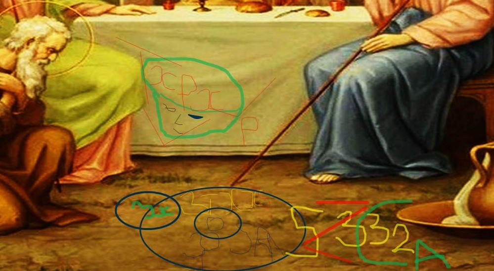 Один архангел показывает на небо, другой чертит на земле знаки, такие важные, что все сосредоточенно их рассматривают. Я даже вижу такой текст: «Тиры (было такое государство в древности) рай. Зри Зиса. Зии Сира»: