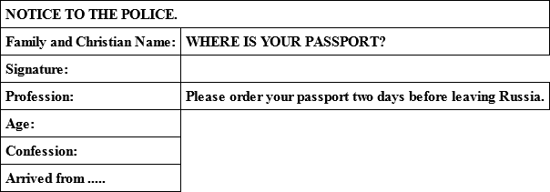 The moment we set foot within the doorway of the hotel, up stepped an official, in blue and gold, and demanded our passports, and we were requested also to sign a paper like the one enclosed, viz.: