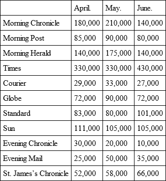 Even in those days, Newspapers were somewhat given to vaunt themselves as to their circulation, but they had no need to call in the aid of the chartered accountant, as they could get their facts from the number of stamps supplied – the stamp then being of the value of three halfpence per newspaper, an impost which was not removed until 15 June, 1855, by the Act 18 and 19 Vict., c. 27. The Times of 5 Aug., 1839, gives us