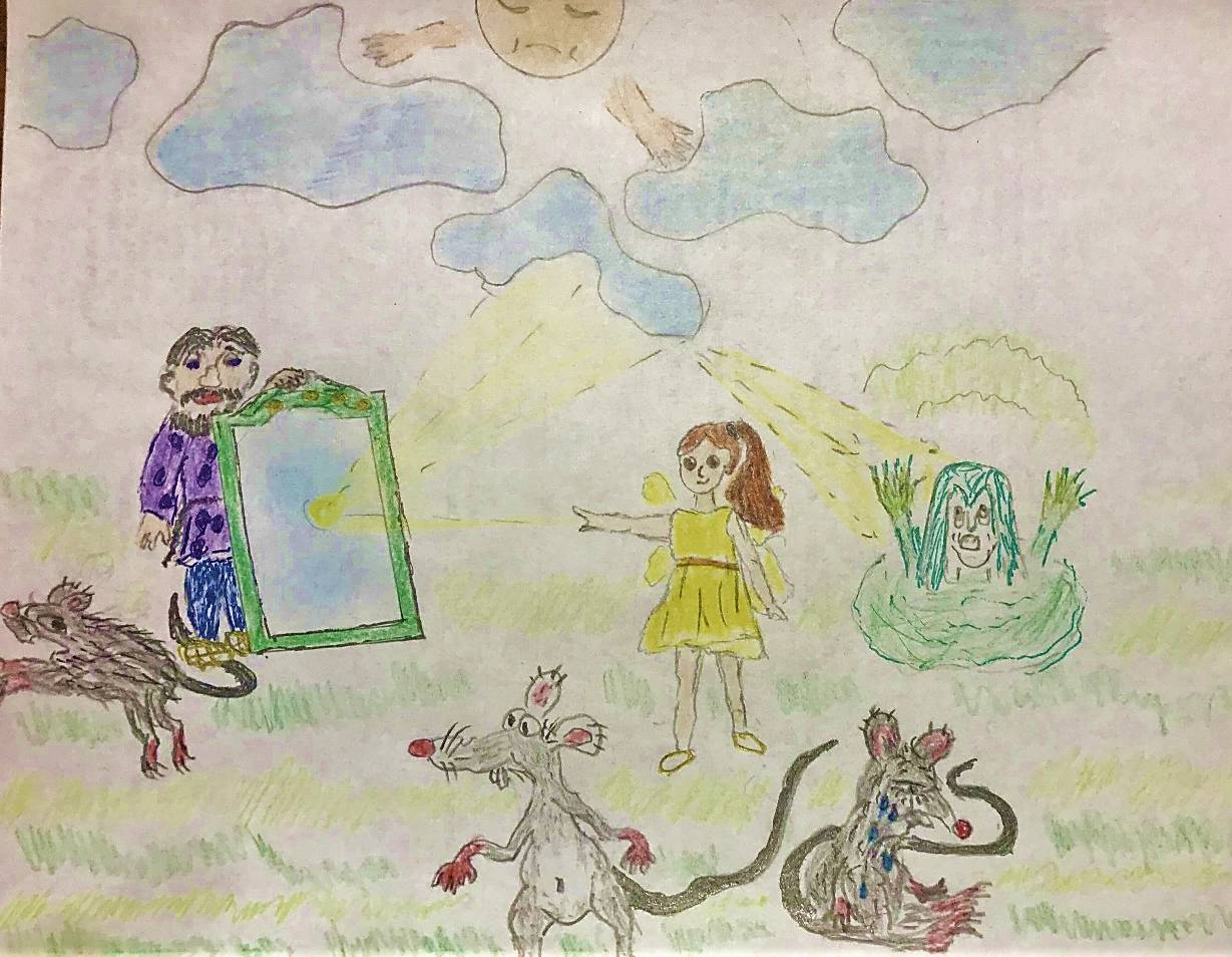 Не узнать теперь было дедушку: стал он снова статен и бодр, в глазах искры озорные, в усах усмешка. Потянула руки вверх Устинья Федоровна – снова молода и красна, улыбчива. Голоса у всех счастливые и звонкие. Пора настала расправиться со спутниками Хвори. Вышли на улицу сельчане. Проплыли люди через озеро и давай крыс да мышей гонять! Взяли мётлы, лопаты и тяпочки. Разбежалась живность нечистая! Стали люди рыть канавы от озера, в сторону от села. Ушла вода. Оставалось как-то дождь унять. Принесли люди все зеркала, что были в селе, поставили вместе и направили в небо. Позвали Пирлу словами известными.