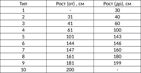 Для того, чтобы сделать типологию более содержательной, признаки сочитают с дополнительными параметрами частотности этих признаков. Для роста это может быть разброс по нормальному распределению на три группы: наиболее часто встречающиеся – средний рост, мало встречающиеся – маленький и высокий рост.
