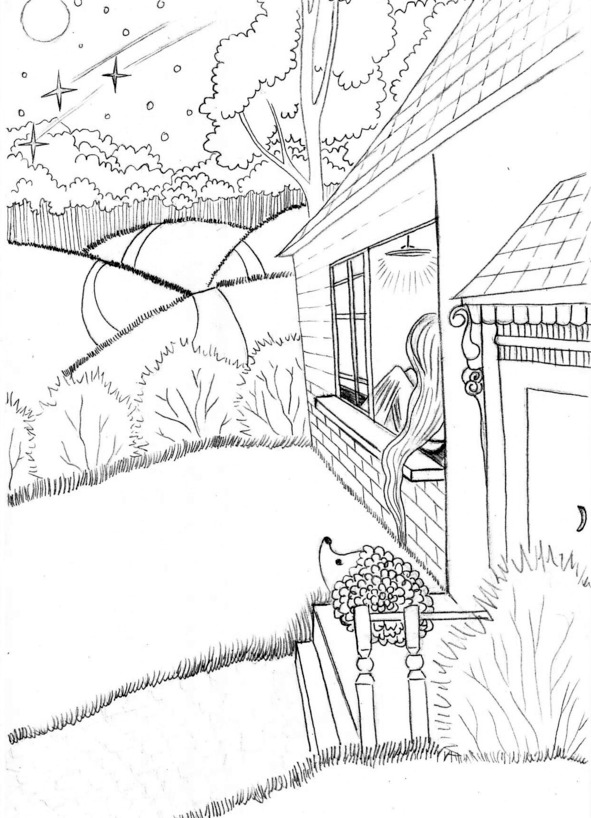 Долго шел он, но вскоре увидел небольшой домик, а в окне его, глядя на звезды, сидела маленькая девочка с длинными распущенными волосами.