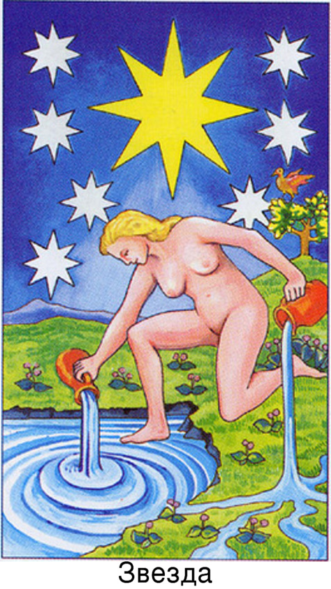 XVII Аркан – это практики, которые помогают нарабатывать качества. Все мы ходим в спортивный зал время от времени и все мы это делаем под эгидой вот этой карты. Тебе нужно сколько-то раз отжаться, что-то сделать со своим телом, чтобы количество постепенно перешло в качество. То, чем занимается эта Девушка – это количественно-качественный переход. Прекрасно понимая, что она не может вычерпать эту воду, она делает это не ради воды.