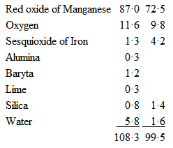 Copper and cobalt both stain glass, the former of a bluish-green colour, while the latter makes it blue; and a small quantity of the latter has great staining power. I have thought it advisable to give analyses of the black oxides of manganese, and they are as follows: