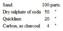 Having considered briefly the manufacture of glass-pots, I shall proceed to the treatment of the materials to be employed. In making common window glass, ordinary sand, which does not contain any very large quantity of iron, may be used, the alkali employed being sulphate of soda, while the purifying material is either arsenic or black oxide of manganese. A small quantity of anthracite coal is added to the mixture, in order to assist in the reduction of the sulphate of soda, together with some lime. The materials are carefully mixed and placed in the furnace, where they are heated for some time, a process which is called "fritting." Its object is to perfectly dry the materials, so as to expel carbonic acid gas, which would otherwise cause swelling in the glass; but no combination must take place, to allow of silicates being formed, otherwise the alkali would melt first and attack the substance of the glass-pots, and part of it would be volatilized and lost. When this operation is completed, the fritt is put into the hot glass-pot, and submitted to the action of the heat of the furnace, until the glass is made, or "founded," as it is technically termed. In the case of sheet and crown glass, this process lasts from sixteen to seventeen hours, for it will be remembered that the top of the pot is open to the furnace, so that the flames pass over the surface of its contents. In this way the materials get heated more rapidly than when a covered glass-pot is used.