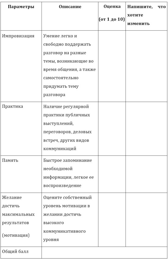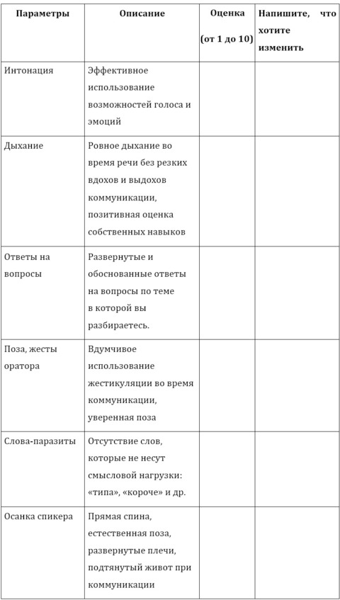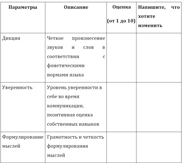 Перед тем как перейти к основным главам, выполните предварительное упражнение – заполните представленную ниже таблицу, честно поставьте баллы в графе «Оценка». Вернитесь к этой таблице после того, как прочтете книгу и выполните упражнения. Еженедельно оценивайте свою речь по указанным параметрам, ведите «Дневник роста» – и вы убедитесь, что достигаете видимых результатов.