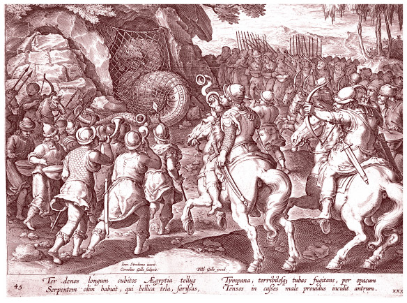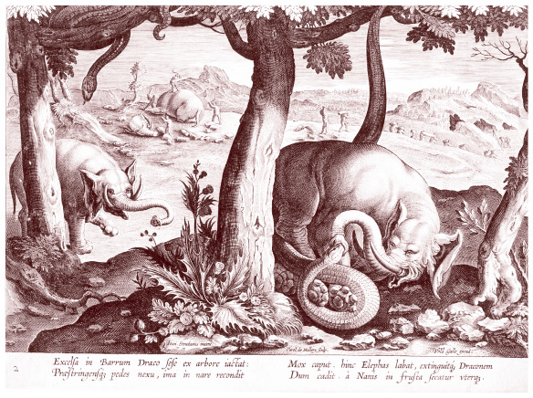 Чудовищные змеи и слоны на гравюре Яна ван дер Страта.